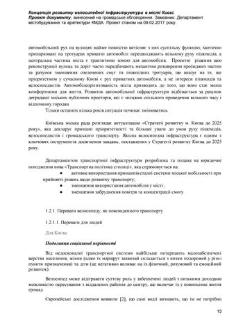 автомобільний рух на вулицях майже повністю витісняє з них суспільну функцію; хаотично припарковані на тротуарах приватні автомобілі перешкоджають вільному руху пішоходів, а центральна частина міста є транзитною зоною для автомобілів. Проектні рішення щоо реконструкції вулиць та доріг часто передбачають механічне розширення проїжджих частин за рахунок зменшення озеленених смуг та пішохідних тротуарів, що вказує на те, що пріоритетним у сучасному Києві є рух приватних автомобілів, а не інтереси пішоходів та велосипедистів. Автомобілеорієнтованість міста призводить до того, що воно стає менш комфортними для життя. Розвиток автомобільної інфраструктури відбувається за рахунок деградації міських публічних просторів, які є місцями спільного проведення вільного часу і відпочинку городян. Тільки останніх кілька років ситуація починає змінюватись. Київська міська рада розглядає актуалізацію «Стратегії розвитку м. Києва до 2025 року», яка декларує принцип пріоритетності та більшої уваги до умов руху пішоходів, велосипедистів і громадського транспорту. Якісна велосипедна інфраструктура є одним з ключових інструментів досягнення завдань, поставлених у Стратегії розвитку Києва до 2025 року. Департаментом транспортної інфраструктури розроблена та подана на юридичне погодження нова «Транспортна політика столиці», яка спрямовується на: ● активне використання принципів сталої системи міської мобільності при прийнятті рішень щодо розвитку транспорту; ● зменшення використання автомобілів у місті; ● зменшення забруднення повітря та концентрації смогу.