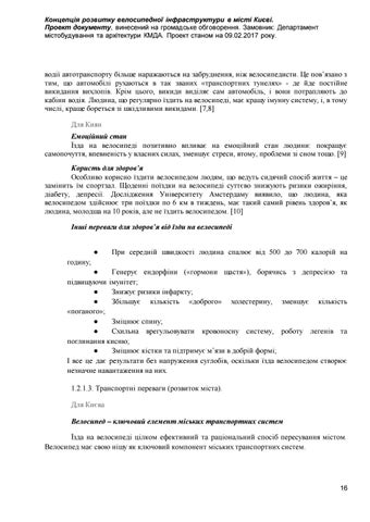 Концепція розвитку велосипедної інфраструктури в місті Києві. Проект документу, винесений на громадське обговорення. Замовник: Департамент містобудування та архітектури КМДА. Проект станом на 09.02.2017 року.