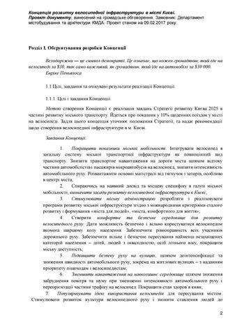 Розділ І. Обґрунтування розробки Концепції Велодоріжки — це символ демократії. Це означає, що кожен громадянин, який їде на велосипеді за $30, так само важливий, як громадянин, який їде на автомобілі за $30 000. Енріке Пеньялоса 1.1.Цілі, завдання та очікувані результати реалізації Концепції. 1.1.1. Цілі і завдання Концепції. Метою створення Концепції є реалізація завдань Стратегії розвитку Києва 2025 в частині розвитку міського транспорту. Йдеться про показник у 10% щоденних поїздок у мі сті на велосипеді. Задля цього концепція уточнює положення Стратегії, та надає рекомендації щодо створення велосипедної інфраструктури в м. Києві. Завдання Концепції. 1. Покращити показники міської мобільності. Інтегрувати велосипед в загальну систему міської транспортної інфраструктури як повноцінний вид транспорту. Знизити транспортне навантаження на дороги міста шляхом відтоку частини автомобілістів і пасажирів мікроавтобусів на велосипед, знизити інтенсивність автомобільного руху. Розвантажити основні магістралі від тягнучок і заторів, особливо в центрі міста; 2. Спираючись на наявний досвід та місцеву специфіку в галузі міської мобільності, визначити засади розвитку велосипедної інфраструктури в Києві; 3. Стимулювати міську адміністрацію розробляти і реалізовувати програми розвитку міської інфраструктури згідно з міжнародними критеріями сталого розвитку і формування «міста для людей», «міста, комфортного для життя»; 4. Створити комфортне та безпечне середовище для розвитку велосипедного руху. Дати можливість безпечно і вільно користуватися велосипедом якомога ширшому колу населення. Забезпечити рівноправність всіх учасників дорожнього руху. Забезпечити вільне і безпечне пересування найменш незахищених категорій населення – дітей, людей з інвалідністю, осіб літнього віку, покращити міську доступність; 5. Підвищити безпеку руху на вулицях, шляхом деінтенсифікації та зниження швидкості автомобільного руху, зокрема на житлових вулицях – з наданням пріоритету пішоходам і велосипедистам; 6. Зменшити навантаження на навколишнє середовище шляхом зниження забруднення повітря та шуму при зменшенні інтенсивності автомобільного руху і переорієнтації частини трафіку на велосипед. Покращити стан здоров`я киян; 7. Популяризувати ідею використання велосипедів для пересування містом. Стимулювати розвиток культури велосипедного руху і змінити ставлення людей до 2