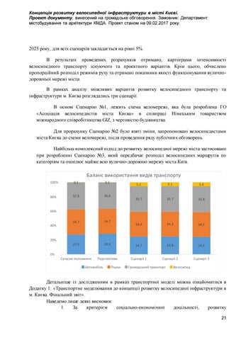 2025 року, для всіх сценаріїв закладається на рівні 5%. В результаті проведених розрахунків отримано, картограми інтенсивності велосипедного транспорту існуючого та проектного варіантів. Крім цього, обчислено пропорційний розподіл режимів руху та отримані показники якості функціонування вуличнодорожньої мережі міста. В рамках аналізу можливих варіантів розвитку велосипедного транспорту та інфраструктури м. Києва розглядались три сценарії. В основі Сценарію №1, лежить схема веломережі, яка була розроблена ГО «Асоціація велосипедистів міста Києва» в співпраці Німецьким товариством міжнародного співробітництва GIZ, з черговістю будівництва. Для прорахунку Сценарію №2 було взяті зміни, запропоновані велосипедистами міста Києва до схеми веломережі, після проведення ряду публічних обговорень. Найбільш комплексний підхід до розвитку велосипедної мережі міста застосовано при розробленні Сценарію №3, який передбачає розподіл велосипедних маршрутів по категоріям та охоплює майже всю вулично-дорожню мережу міста Київ.