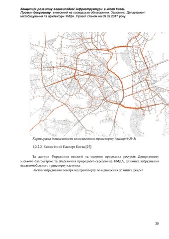 Картограма інтенсивності велосипедного транспорту (сценарій № 3) 1.2.2.2. Екологічний Паспорт Києва [27] За даними Управління екології та охорони природних ресурсів Департаменту міського благоустрою та збереження природного середовища КМДА, динаміка забруднення від автомобільного транспорту наступна: Частка забруднення повітря від транспорту по відношення до інших джерел