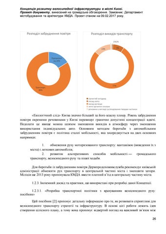 «Екологічний слід» Києва значно більший за його власну площу. Рівень забруднення повітря окремими речовинами у Києві перевищує гранично допустимі концентрації вдвічі. Подолати це явище можна шляхом зменшення викидів в атмосферу через зменшення використання індивідуальних авто. Основним методом боротьби з автомобільним забрудненням повітря є політика сталої мобільності, яка зосереджується на двох основних напрямках: 1. обмеження руху моторизованого транспорту: вантажівок (виведення їх з міста) і легкових автомобілів; 2. розвиток альтеративних способів мобільності — громадського транспорту, велосипедного руху та пішої ходьби. Для боротьби із забрудненням повітря Держпродспоживслужба рекомендує київській адміністрації обмежити рух транспорту в центральній частині міста і зменшити затори. Міліція ще 2013 року пропонувала КМДА ввести платний в’їзд в центральну частину міста. 1.2.3. Іноземний досвід та практики, що використані при розробці даної Концепції. 1.2.3.1. «Розробка транспортної політики з врахуванням велосипедного руху: посібник» Цей посібник [2] пропонує детальну інформацію про те, як розвивати сприятливі для велосипедного транспорту стратегії та інфраструктуру. В основі цієї роботи лежить ідея створення цілісного плану, а тому вона пропонує відвертий погляд на важливий зв’язок між 26