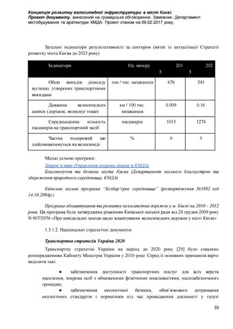Міські цільові програми: Здоров’я киян (Управління охорони здоров’я КМДА) Благополуччя та безпека міста Києва (Департамент міського благоустрою та збереження природного середовища, КМДА) Київська міська програма “Безбар’єрне середовище” (розпорядження №1882 від 14.10.2004р.) Програма облаштування та розвитку велосипедних доріжок у м. Києві на 2010 - 2012 роки. Ця програма була затверджена рішенням Київської міської ради від 24 грудня 2009 року N 907/2976 «Про невідкладні заходи щодо влаштування велосипедних доріжок у місті Києві» 1.3.1.2. Національні стратегічні документи. Транспортна стратегія України 2020 Транспортну стратегію України на період до 2020 року [29] було схвалено розпорядженням Кабінету Міністрів України у 2010 році. Серед її основних принципів варто виділити такі: ● забезпечення доступності транспортних послуг для всіх верств населення, зокрема осіб з обмеженими фізичними можливостями, малозабезпечених громадян; ● забезпечення екологічної безпеки, обов’язкового дотримання екологічних стандартів і нормативів під час провадження діяльності у галузі 33