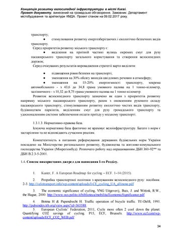2. Розробка транспортної політики з врахуванням велосипедного руху: посібник. 2-3. http://velotransport.info/wp-content/uploads/I-CE_cycling_UA_allinone.pdf 3. The economic significance of cycling, VNG Uitgeverij, Buis, J. and Wittink, R.W., the Hague, 2000. http://www.ocs.polito.it/biblioteca/mobilita/EconomicSignificance.pdf 4. Botma H & Papendrecht H. Traffic operation of bicycle traffic. TU-Delft, 1991. http://pubsindex.trb.org/view.aspx?id=365588. 5. European Cyclists’ Federation, 2011, Cycle more often 2 cool down the planet: Quantifying CO2 savings of cycling. P15, ECF, Brussels. http://www.ecf.com/wpcontent/uploads/ECF_CO2_WEB.pdf 34