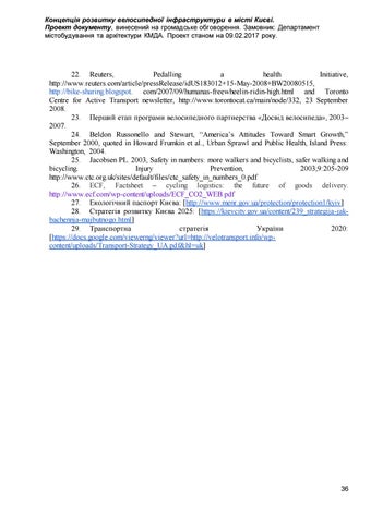 22. Reuters, Pedalling a health Initiative, http://www.reuters.com/article/pressRelease/idUS183012+15-May-2008+BW20080515, http://bike-sharing.blogspot. com/2007/09/humanas-freewheelin-ridin-high.html and Toronto Centre for Active Transport newsletter, http://www.torontocat.ca/main/node/332, 23 September 2008. 23. Перший етап програми велосипедного партнерства «Досвід велосипеда», 2003– 2007. 24. Beldon Russonello and Stewart, “America’s Attitudes Toward Smart Growth,” September 2000, quoted in Howard Frumkin et al., Urban Sprawl and Public Health, Island Press: Washington, 2004. 25. Jacobsen PL. 2003, Safety in numbers: more walkers and bicyclists, safer walking and bicycling. Injury Prevention, 2003;9:205-209 http://www.ctc.org.uk/sites/default/files/ctc_safety_in_numbers_0.pdf 26. ECF, Factsheet – cycling logistics: the future of goods delivery. http://www.ecf.com/wp-content/uploads/ECF_CO2_WEB.pdf 27. Екологічний паспорт Києва: [http://www.menr.gov.ua/protection/protection1/kyiv] 28. Стратегія розвитку Києва 2025: [https://kievcity.gov.ua/content/239_strategija-jakbachennja-majbutnogo.html] 29. Транспортна стратегія України 2020: [https://docs.google.com/viewerng/viewer?url=http://velotransport.info/wpcontent/uploads/Transport-Strategy_UA.pdf&hl=uk]