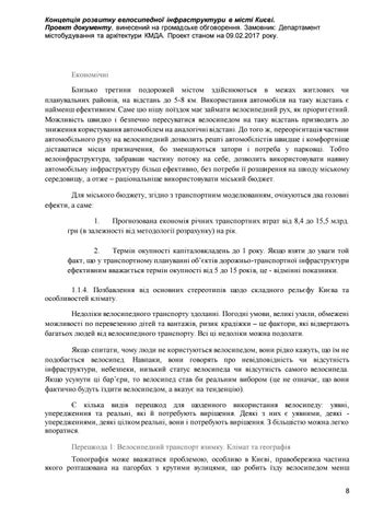 Економічні Близько третини подорожей містом здійснюються в межах житлових чи планувальних районів, на відстань до 5-8 км. Використання автомобіля на таку відстань є найменш ефективним. Саме цю нішу поїздок має займати велосипедний рух, як пріорит етний. Можливість швидко і безпечно пересуватися велосипедом на таку відстань призводить до зниження користування автомобілем на аналогічні відстані. До того ж, переорієнтація частини автомобільного руху на велосипедний дозволить решті автомобілістів швидше і комфортніше діставатися місця призначення, бо зменшуються затори і потреба у парковці. Тобто велоінфраструктура, забравши частину потоку на себе, дозволить використовувати наявну автомобільну інфраструктуру більш ефективно, без потреби її розширення на шкоду міському середовищу, а отже – раціональніше використовувати міський бюджет. Для міського бюджету, згідно з транспортним моделюванням, очікуються два головні ефекти, а саме: 1. Прогнозована економія річних транспортних втрат від 8,4 до 15,5 млрд. грн (в залежності від методології розрахунку) на рік. 2. Термін окупності капіталовкладень до 1 року. Якщо взяти до уваги той факт, що у транспортному плануванні об’єктів дорожньо-транспортної інфраструктури ефективним вважається термін окупності від 5 до 15 років, це - відмінні показники. 1.1.4. Позбавлення від основних стереотипів щодо складного рельєфу Києва та особливостей клімату. Недоліки велосипедного транспорту здоланні. Погодні умови, великі ухили, обмежені можливості по перевезенню дітей та вантажів, ризик крадіжки – це фактори, які відвертають багатьох людей від велосипедного транспорту. Всі ці недоліки можна подолати. Якщо спитати, чому люди не користуються велосипедом, вони рідко кажуть, що їм не подобається велосипед. Навпаки, вони говорять про невідповідність чи відсутність інфраструктури, небезпеки, низький статус велосипеда чи відсутність самого велосипеда. Якщо усунути ці бар’єри, то велосипед став би реальним вибором (це не означає, що вони фактично будуть їздити велосипедом, а вказує на тенденцію). Є кілька видів перешкод для щоденного використання велосипеду: уявні, упередженння та реальні, які й потребують вирішення. Деякі з них є уявними, деякі упередженнями, деякі цілком реальні, вони і потребують вирішення. З більшістю можна легко впоратися. Перешкода 1: Велосипедний транспорт взимку. Клімат та географія Топографія може вважатися проблемою, особливо в Києві, правобережна частина якого розташована на пагорбах з крутими вулицями, що робить їзду велосипедом менш 8