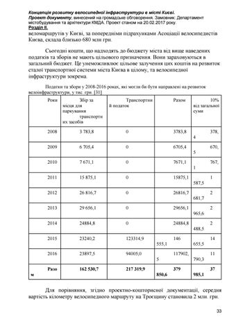 веломаршрутів у Києві, за попередніми підрахунками Асоціації велосипедистів Києва, склала близько 680 млн грн. Сьогодні кошти, що надходять до бюджету міста від вище наведених податків та зборів не мають цільового призначення. Вони зараховуються в загальний бюджет. Це унеможливлює цільове залучення цих коштів на розвиток сталої транспортної системи міста Києва в цілому, та велосипедної інфраструктури зокрема. Податки та збори у 2008-2016 роках, які могли би бути направлені на розвиток велоінфраструктури, у тис. грн. [31] Роки