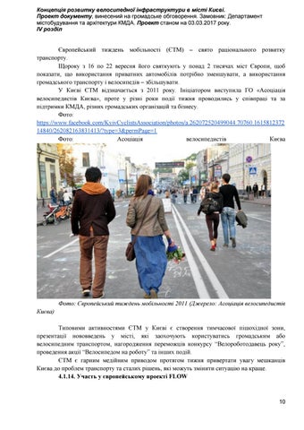 Фото: Європейський тиждень мобільності 2011 (Джерело: Асоціація велосипедистів Києва) Типовими активностями ЄТМ у Києві є створення тимчасової пішохідної зони, презентації нововведень у місті, які заохочують користуватись громадським або велосипедним транспортом, нагородження переможців конкурсу “Велороботодавець року”, проведення акції “Велосипедом на роботу” та інших подій. ЄТМ є гарним медійним приводом протягом тижня привертати увагу мешканців Києва до проблем транспорту та сталих рішень, які можуть змінити ситуацію на краще. 4.1.14. Участь у європейському проекті FLOW