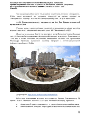 Такі велосипедні стійки мають більш надійну конструкцію, порівняно з попередніми. Стійки також встановлені для тестування конструкції на предмет зручності та довготривалості. Наразі усі велосипедні стійки у справному стані і не були пошкоджені. 4.1.16. Відновлення велотреку та створення на його бази Центру велосипедної культури в м. Києві Учасники процесу: самоорганізована громадськість (велосипедисти, місцеві жителі та колишні спортсмени), районна та міська адміністрація, КП "Житлоінвестбуд-УКБ". Процес та результати: Довгий час велотрек у центрі Києва поступово руйнувався через будівництво багатоповерхівки у безпосередній близькості до велотреку. Розпочавшись у 2014 році з низової ініціативи представників велосипедної спільноти під керівництвом Олександра Пригунова, відновлення велотреку переросло в інституціоналізований інфрастуктурний проект КМДА.