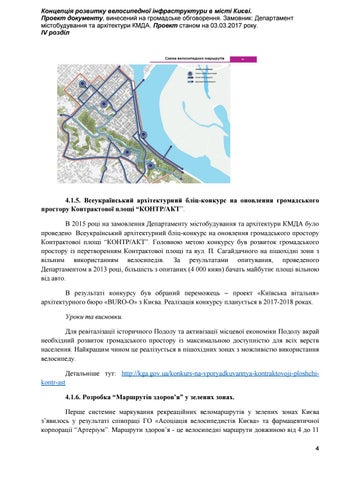 4.1.5. Всеукраїнський архітектурний бліц-конкурс на оновлення громадського простору Контрактової площі “КОНТР/АКТ”. В 2015 році на замовлення Департаменту містобудування та архітектури КМДА було проведено Всеукраїнський архітектурний бліц-конкурс на оновлення громадського простору Контрактової площі “КОНТР/АКТ”. Головною метою конкурсу був розвиток громадського простору із перетворенням Контрактової площі та вул. П. Сагайдачного на пішохідні зони з вільним використанням велосипедів. За результатами опитування, проведеного Департаментом в 2013 році, більшість з опитаних (4 000 киян) бачать майбутнє площі вільною від авто. В результаті конкурсу був обраний переможець – проект «Київська вітальня» архітектурного бюро «BURO-O» з Києва. Реалізація конкурсу планується в 2017-2018 роках. Уроки та висновки. Для ревіталізації історичного Подолу та активізації місцевої економіки Подолу вкрай необхідний розвиток громадського простору із максимальною доступністю для всіх верств населення. Найкращим чином це реалізується в пішохідних зонах з можливістю використання велосипеду. Детальніше тут: http://kga.gov.ua/konkurs-na-vporyadkuvannya-kontraktovoji-ploshchikontr-ast 4.1.6. Розробка “Маршрутів здоров’я” у зелених зонах. Перше системне маркування рекреаційних веломаршрутів у зелених зонах Києва з’явилось у результаті співпраці ГО «Асоціація велосипедистів Києва» та фармацевтичної корпорації “Артеріум”. Маршрути здоров’я - це велосипедні маршрути довжиною від 4 до 11 4