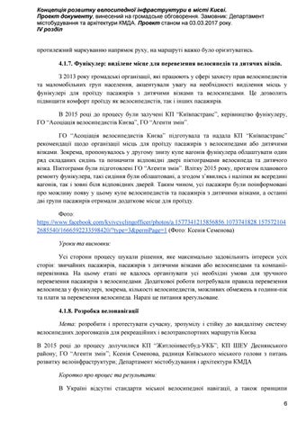 протилежний маркуванню напрямок руху, на маршруті важко було орієнтуватись. 4.1.7. Фунікулер: виділене місце для перевезення велосипедів та дитячих візків. З 2013 року громадські організації, які працюють у сфері захисту прав велосипедистів та маломобільних груп населення, акцентували увагу на необхідності виділення місць у фунікулері для проїзду пасажирів з дитячими візками та велосипедами. Це дозволить підвищити комфорт проїзду як велосипедистів, так і інших пасажирів. В 2015 році до процесу були залучені КП “Київпастранс”, керівництво фунікулеру, ГО “Асоціація велосипедистів Києва”, ГО “Агенти змін”. ГО “Асоціація велосипедистів Києва” підготувала та надала КП “Київпастранс” рекомендації щодо організації місць для проїзду пасажирів з велосипедами або дитячими візками. Зокрема, пропонувалось у другому знизу купе вагонів фунікулера облаштувати один ряд складаних сидінь та позначити відповідні двері піктограмами велосипеда та дитячого візка. Піктограми були підготовлені ГО “Агенти змін”. Влітку 2015 року, протягом планового ремонту фунікулера, такі сидіння були облаштовані, а згодом з’явились і наліпки як всередині вагонів, так і зовні біля відповідних дверей. Таким чином, усі пасажири були поінформовані про можливу появу у цьому купе велосипедистів та пасажирів з дитячими візками, а останні дві групи пасажирів отримали додаткове місце для проїзду. Фото: https://www.facebook.com/kyivcyclingofficer/photos/a.1577341215856856.1073741828.157572104 2685540/1666592233598420/?type=3&permPage=1 (Фото: Ксенія Семенова) Уроки та висновки: Усі сторони процесу шукали рішення, яке максимально задовільнить інтереси усіх сторін: звичайних пасажирів, пасажирів з дитячими візками або велосипедами та компаніїперевізника. На цьому етапі не вдалось організувати усі необхідні умови для зручного перевезення пасажирів з велосипедами. Додаткової роботи потребували правила перевезення велосипеда у фунікулері, зокрема, кількості велосипедистів, можливих обмежень в години-пік та плати за перевезення велосипеда. Наразі це питання врегульоване. 4.1.8. Розробка велонавігації Мета: розробити і протестувати сучасну, зрозумілу і стійку до вандалізму систему велосипедних дороговказів для рекреаційних і велотранспортних маршрутів Києва В 2015 році до процесу долучилися КП “Житлоінвестбуд-УКБ”; КП ШЕУ Деснянського району; ГО “Агенти змін”; Ксенія Семенова, радниця Київського міського голови з питань розвитку велоінфраструктури; Департамент містобудування і архітектури КМДА Коротко про процес та результати: В Україні відсутні стандарти міської велосипедної навігації, а також принципи 6