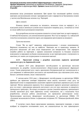 визначення місць розміщення вказівників. Цей проект був покликаний зробити пілотну навігацію для велосипедних поїздок і промаркувати один з маршрутів на Трухановому острові у частині між Матвіївською затокою та р. Чорторий. (фото локації) Команда проекту виїжджала на місцевість, визначала точки на маршруті, де у відвідувача можуть виникнути сумніви щодо подальшого напрямку руху, і позначала ці точки як місця майбутнього розміщення покажчиків. Була розроблена система кодування елементів та їхньої прив’язки до карти маршруту. Стовбчики бетонувались для унеможливлення крадіжки. На в’їзді на маршрут та у найдальній точці було встановлено схематичні карти для покращення орієнтування на місцевості. Уроки та висновки: Схеми “Ви на карті” виявились нефункціональними і складно оновлюваними. Вирішили відмовитись від них на майбутнє. Навігацію все ж намагались знищити. В результаті вандальних дій вона стала непридатною для використання. Такі маршрути потрібно робити на територіях с кращим соціальним контролем та більшою кількістю відвідувачів та передавати на баланс відповідальному за цю територію разом з інструкцією та макетами усіх знаків для підтримування та оновлення навігації. 4.1.9. Проектний семінар з розробки додаткових варіантів організації дорожнього руху на Дарницькій площі. У вересні 2015 року Департамент містобудування та архітектури виступив замовником на розробку техніко-економічного обґрунтування реконструкції Дарницької площі. Умови реорганізації руху мають враховувати безперешкодний рух велосипедистів в усіх напрямках та забезпечувати доступність для маломобільних груп населення (літні люди, батьки з дитячими візками, люди з інвалідністю). У лютому-квітні 2016 року у Департаменті містобудування та архітектури КМДА пройшли два проектних семінари (воркшопи) щодо аналізу поточного стану руху на Дарницькій площі та напрацюванню додаткових варіантів організації дорожнього руху на цій території. Метою проведення воркшопу було напрацювати варіанти організації дорожнього руху на площі з урахуванням принципів доступності для усіх груп населення та приорітету громадського транспорту. На основі узгодженого групою учасників воркшопу принципового способу організації руху через Дарницьку площу планувалось, що у подальшому буде розроблятись детальна робоча документація для проведення реконструкції площі. Організаторами виступили Департамент містобудування та архітектури КМДА, ГО «Асоціація велосипедистів Києва» за фінансової підтримки ГО “Німецько-російський обмін (DRA). У зустрічах участь брали представники замовника, транспортні інженери, а також відібрані за відкритим оголошенням охочі, які спеціалізуються на темі транспортного 7