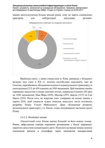 Проблема смогу, з якою стикнулося м. Київ, виникала у більшості великих міст світу в ХХ ст. поточні містобудівні документи, такі як Генплан, передбачають збільшення кількості індивідуального транспорту із сьогоднішньої 213 до 450 одиниць на 1000 мешканців. Цей показник значно перевищує аналогічні в інших світових містах, наприклад Гонконг (59 авто на 1000 мешканців), Нью Йорк (209), Москва (297), Берлін (317) чи Сан Паоло (359). Після того, як вчергове смог утворився на кілька тижнів у серпні 2016, щоб уникнути чужих помилок минулого, місто оголосило розробку Плану Сталої Мобільності. Дана «Концепція розвитку велосипедного транспорту у м. Києві» стане інтегрованою частиною цього Плану. 2.4.1.2. Необхідні заходи «Екологічний слід» Києва значно більший за його власну площу. Рівень забруднення повітря окремими речовинами у Києві перевищує гранично допустимі концентрації удвічі. Подолати це явище можна шляхом зменшення викидів в атмосферу через зменшення використання 4