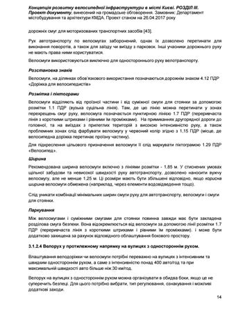 Концепція розвитку велосипедної інфраструктури в місті Києві. РОЗДІЛ ІІІ. Проект документу, винесений на громадське обговорення. Замовник: Департамент містобудування та архітектури КМДА. Проект станом на 26.04.2017 року дорожніх смуг для моторизованих транспортних засобів [43]. Рух автотранспорту по велосмугах заборонений, однак їх дозволено перетинати для виконання поворотів, а також для заїзду чи виїзду з парковок. Інші учасники дорожнього руху не мають права ними користуватися. Велосмуги використовуються виключно для одностороннього руху велотранспорту. Розстановка знаків Велосмуги, на ділянках обов’язкового використання позначаються дорожнім знаком 4.12 ПДР «Доріжка для велосипедистів» Розмітка і піктограми Велосмуги відділяють від проїзної частини і від суміжної смуги для стоянки за допомогою розмітки 1.1 ПДР (вузька суцільна лінія). Там, де цю лінію можна перетинати у зонах перехрещень смуг руху, велосмуга позначається пунктирною лінією 1.7 ПДР (переривчаста лінія з короткими штрихами і рівними їм проміжками). На примиканнях другорядної дороги до головної, та на виїздах з прилеглих територій з високою інтенсивністю руху, а також проблемних зонах слід фарбувати велосмугу у червоний колір згідно з 1,15 ПДР (місце, де велосипедна доріжка перетинає проїзну частину). Для підкреслення цільового призначення велосмуги її слід маркувати піктограмою 1.29 ПДР «Велосипед». Ширина Рекомендована ширина велосмуги включно з лініями розмітки - 1,85 м. У стиснених умовах щільної забудови та невисокої швидкості руху автотранспорту, дозволено наносити вужчу велосмугу, але не менше 1,25 м. Ці розміри мають бути збільшені відповідно, якщо корисна ширина велосмуги обмежена (наприклад, через елементи водовідведення тощо). Слід уникати комбінації мінімальних ширин смуги руху для автотранспорту, велосмуги і смуги для стоянки. Паркування Між велосмугами і суміжними смугами для стоянки повинна завжди має бути закладена розділова смуга безпеки. Вона відокремлюється від велосмуги за допомогою лінії розмітки 1.7 ПДР (переривчаста лінія з короткими штрихами і рівними їм проміжками). і може бути додатково захищена за рахунок відповідного облаштування бокового простору. 3.1.2.4 Велорух у протилежному напрямку на вулицях з одностороннім рухом. Влаштування велодоріжки чи велосмуги потрібні переважно на вулицях з інтенсивним та швидким одностороннім рухом, а саме з інтенсивністю понад 400 авто/год та при максимальній швидкості авто більше ніж 30 км/год. Велорух на вулицях з одностороннім рухом можна організувати в обидва боки, якщо це не суперечить безпеці. Для цього потрібно вибрати, тип регулювання, ознакування і можливі додаткові заходи. 14