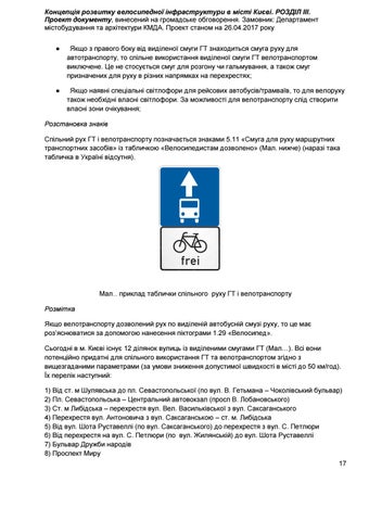 Мал... приклад таблички спільного руху ГТ і велотранспорту Розмітка Якщо велотранспорту дозволений рух по виділеній автобусній смузі руху, то це має роз’яснюватися за допомогою нанесення піктограми 1.29 «Велосипед». Сьогодні в м. Києві існує 12 ділянок вулиць із виділеними смугами ГТ (Мал…). Всі вони потенційно придатні для спільного використання ГТ та велотранспортом згідно з вищезгаданими параметрами (за умови зниження допустимої швидкості в місті до 50 км/год). Їх перелік наступний: 1) Від ст. м Шулявська до пл. Севастопольської (по вул. В. Гетьмана – Чоколівський бульвар) 2) Пл. Севастопольська – Центральний автовокзал (просп В. Лобановського) 3) Ст. м Либідська – перехрестя вул. Вел. Васильківської з вул. Саксаганського 4) Перехрестя вул. Антоновича з вул. Саксаганською – ст. м. Либідська 5) Від вул. Шота Руставеллі (по вул. Саксаганського) до перехрестя з вул. С. Петлюри 6) Від перехрестя на вул. С. Петлюри (по вул. Жилянській) до вул. Шота Руставеллі 7) Бульвар Дружби народів 8) Проспект Миру 17