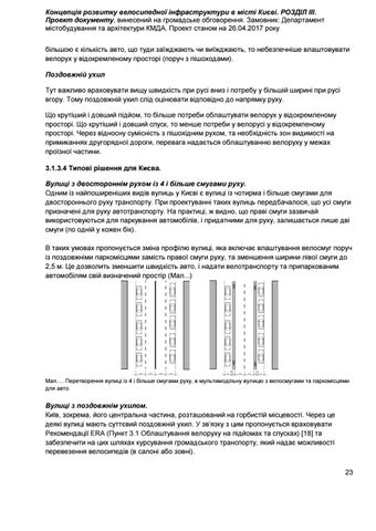 Вулиці з поздовжнім ухилом. Київ, зокрема, його центральна частина, розташований на горбистій місцевості. Через це деякі вулиці мають суттєвий поздовжній ухил. У зв’язку з цим пропонується враховувати Рекомендації ERA (Пункт 3.1 Облаштування велоруху на підйомах та спусках) [18] та забезпечити на цих шляхах курсування громадського транспорту, який надає можливості перевезення велосипедів (в салоні або зовні). 23