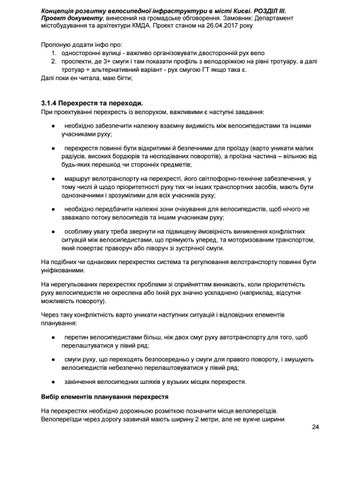 Концепція розвитку велосипедної інфраструктури в місті Києві. РОЗДІЛ ІІІ. Проект документу, винесений на громадське обговорення. Замовник: Департамент містобудування та архітектури КМДА. Проект станом на 26.04.2017 року Пропоную додати інфо про: 1. односторонні вулиці - важливо організовувати двосторонній рух вело 2. проспекти, де 3+ смуги і там показати профіль з велодоріжкою на рівні тротуару, а далі тротуар + альтернативний варіант - рух смугою ГТ якщо така є. Далі поки ен читала, маю бігти;