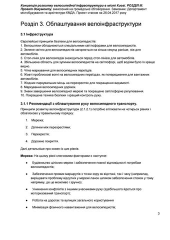 Концепція розвитку велосипедної інфраструктури в місті Києві. РОЗДІЛ ІІІ. Проект документу, винесений на громадське обговорення. Замовник: Департамент містобудування та архітектури КМДА. Проект станом на 26.04.2017 року