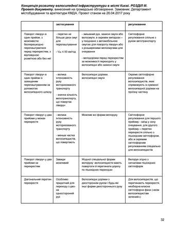 Концепція розвитку велосипедної інфраструктури в місті Києві. РОЗДІЛ ІІІ. Проект документу, винесений на громадське обговорення. Замовник: Департамент містобудування та архітектури КМДА. Проект станом на 26.04.2017 року застосування