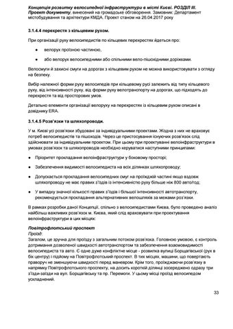 В рамках розробки даної Концепції, спільно з велосипедистами Києва, було проведено аналіз найбільш важливих розв’язок м. Києва, який слід враховувати при проектування велоінфраструктури в цих місцях: Повітрофлотський проспект Проїзд: Загалом, це зручна для проїзду з загальним потоком розв’язка. Головною умовою, є контроль дотримання дозволеної швидкості автотранспортом та забезпечення взаємовидимості велосипедиста та авто. Є одне дуже конфліктне місце - розвилка вулиці Борщагівської (рух в бік центру) і підйому на Повітрофлотський проспект. В тих місцях, машини, що повертають праворуч не зменшуючи швидкості перед маневром. Крім того, проїжджаючи розв’язку в напрямку Повітрофлотського проспекту, на досить короткій ділянці зосереджено одразу три з’їзди-заїзди на вул. Борщагівську та пр. Перемоги. У цьому місці проїзд велосипедом ускладнений. 33