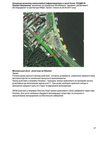 Московський міст - розв’язка на Оболоні Проїзд Головна умова зручного проїзду розв”язки - контроль дотримання дозволеної швидкості руху автотранспортом та позначення присутності велосипедистів. Проїзд розв”язки у напрямку Петрівка - Троєщина, можна здійснювати на проїжджій частині, дозволивши рух велосипедів смугою для ГТ. При цьому необхідно здійснити заходи зі зменшення швидкості руху на з”їздах та маркування велопереїздів. Об’їзд розв’язки у напрямку Оболонь-Поділ можна здійснювати з боку набережної через парк Наталка. Для цього необхідно збудувати веломаршрут попри парк та сполучити з прогулянковою велодоріжкою на Оболонській набережній.