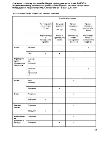 Концепція розвитку велосипедної інфраструктури в місті Києві. РОЗДІЛ ІІІ. Проект документу, винесений на громадське обговорення. Замовник: Департамент містобудування та архітектури КМДА. Проект станом на 26.04.2017 року Типологія велопарковок в залежності від тривалості паркування. Тривалість паркування