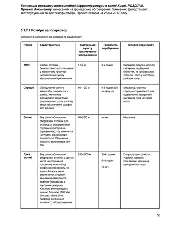 Концепція розвитку велосипедної інфраструктури в місті Києві. РОЗДІЛ ІІІ. Проект документу, винесений на громадське обговорення. Замовник: Департамент містобудування та архітектури КМДА. Проект станом на 26.04.2017 року