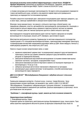 Концепція розвитку велосипедної інфраструктури в місті Києві. РОЗДІЛ ІІІ. Проект документу, винесений на громадське обговорення. Замовник: Департамент містобудування та архітектури КМДА. Проект станом на 26.04.2017 року з чіткими сигналами для пішоходів і велосипедистів. Не варто сліпо розширювати перехрестя і смуги автомобільного руху, натомість слід виділити окремі смуги для громадського транспорту на перехрестях та інтенсивних вулицях. Потрібно запустити позитивний цикл: зменшення площі/ширини доріг зменшує швидкість, що, в свою чергу, зменшує привабливість використання приватними автомобілями. Можливо також використання, так званого «спільного простору» (shared space), яке передбачає обережне «злиття» автомобілістів і велосипедистів, велосипедистів і пішоходів, а також розвиток щільної мережі місць наземного перетину проїзної частини на окремих вулицях і площах, рівно як і висока пропускна здатність самого міського простору. Без покращення стандартів проектування доріг в містах Україні з фокусом на потреби велосипедистів та пішоходів, кількість ДТП, ймовірно, зростатиме й надалі. Міністерство регіонального розвитку, будівництва та житлово-комунального господарства України разом з ГО «Асоціація велосипедистів Києва», практикуючими інженерами транспорту та міжнародними експертами напрацювали відповідні зміни до ДБН. Вони набудуть чинності у новій редакції документа, яка очікується у 2017 році. Нижче ж подані основні запропоновані зміни, а саме: ●