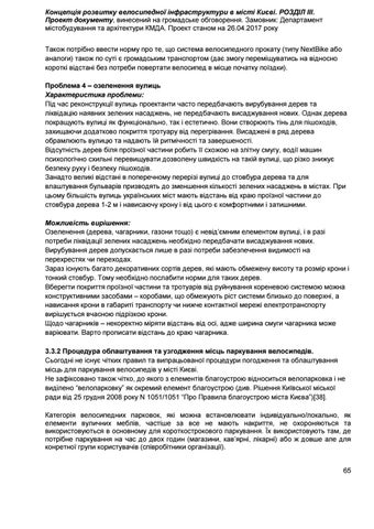 Концепція розвитку велосипедної інфраструктури в місті Києві. РОЗДІЛ ІІІ. Проект документу, винесений на громадське обговорення. Замовник: Департамент містобудування та архітектури КМДА. Проект станом на 26.04.2017 року Також потрібно ввести норму про те, що система велосипедного прокату (типу NextBike або аналоги) також по суті є громадським транспортом (дає змогу переміщуватись на відносно короткі відстані без потреби повертати велосипед в місце початку поїздки). Проблема 4 – озеленення вулиць Характеристика проблеми: Під час реконструкції вулиць проектанти часто передбачають вирубування дерев та ліквідацію наявних зелених насаджень, не передбачають висаджування нових. Однак дерева покращують вулиці як функціонально, так і естетично. Вони створюють тінь для пішоходів, захищаючи додатково покриття тротуару від перегрівання. Висаджені в ряд дерева обрамлюють вулицю та надають їй ритмічності та завершеності. Відсутність дерев біля проїзної частини робить її схожою на злітну смугу, водії машин психологічно схильні перевищувати дозволену швидкість на такій вулиці, що різко знижує безпеку руху і безпеку пішоходів. Занадто великі відстані в поперечному перерізі вулиці до стовбура дерева та для влаштування бульварів призводять до зменшення кількості зелених насаджень в містах. При цьому більшість вулиць українських міст мають відстань від краю проїзної частини до стовбура дерева 1-2 м і нависаючу крону і від цього є комфортними і затишними. Можливість вирішення: Озеленення (дерева, чагарники, газони тощо) є невід’ємним елементом вулиці, і в разі потреби ліквідації зелених насаджень необхідно передбачати висаджування нових. Вирубування дерев допускається лише в разі потреби забезпечення видимості на перехрестях чи переходах. Зараз існують багато декоративних сортів дерев, які мають обмежену висоту та розмір крони і тонкий стовбур. Тому необхідно послабити норми для таких дерев. Вберегти покриття проїзної частини та тротуарів від руйнування кореневою системою можна конструктивними засобами – коробами, що обмежують ріст системи близько до поверхні, а нависання крони в габариті транспорту чи нижче контактної мережі електротранспорту вирішується вчасною підрізкою крони. Щодо чагарників – некоректно міряти відстань від осі, адже ширина смуги чагарника може варіювати. Варто прописати відстань до краю чагарника. 3.3.2 Процедура облаштування та узгодження місць паркування велосипедів. Сьогодні не існує чітких правил та випрацьованої процедури погодження та облаштування місць для паркування велосипедів у місті Києві. Не зафіксовано також чітко, до якого з елементів благоустрою відноситься велопарковка і не виділено “велопарковку” як окремий елемент благоустрою (див. Рішення Київської міської ради від 25 грудня 2008 року N 1051/1051 “Про Правила благоустрою міста Києва”)[38]. Категорія велосипедних парковок, які можна встановлювати індивідуально/локально, як елементи вуличних меблів, частіше за все не мають накриття, не охороняються та використовуються в основному для короткострокового паркування. Їх використовують там, де потрібне паркування на час до двох годин (магазини, кав’ярні, лікарні) або ж довше але для конретної групи користувачів (співробітники організації). 65
