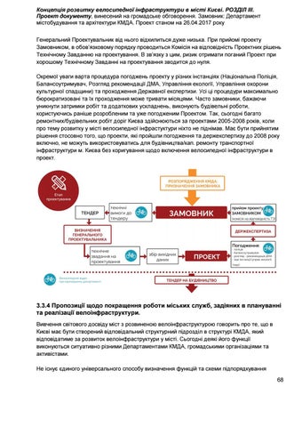 Концепція розвитку велосипедної інфраструктури в місті Києві. РОЗДІЛ ІІІ. Проект документу, винесений на громадське обговорення. Замовник: Департамент містобудування та архітектури КМДА. Проект станом на 26.04.2017 року Генеральний Проектувальник від нього відхилиться дуже низька. При прийомі проекту Замовником, в обов’язковому порядку проводиться Комісія на відповідність Проектних рішень Технічному Завданню на проектування. В зв’язку з цим, ризик отримати поганий Проект при хорошому Технічному Завданні на проектування зводится до нуля. Окремої уваги варта процедура погоджень проекту у різних інстанціях (Національна Поліція, Балансоутримувач, Розгляд рекомендації ДМА, Управління екології, Управління охорони культурної спадщини) та проходження Державної експертизи. Усі ці процедури максимально бюрократизовані та їх проходження може тривати місяцями. Часто замовники, бажаючи уникнути затримки робіт та додаткових ускладнень, виконують будівельні роботи, користуючись раніше розробленим та уже погодженим Проектом. Так, сьогодні багато ремонтних/будівельних робіт доріг Києва здійснюються за проектами 2005-2008 років, коли про тему розвитку у місті велосипедної інфрастуктури ніхто не піднімав. Має бути прийнятим рішення стосовно того, що проекти, які пройшли погодження та держекспертизу до 2008 року включно, не можуть використовуватись для будівництва/кап. ремонту транспортної інфраструктури м. Києва без коригування щодо включення велосипедної інфраструктури в проект.