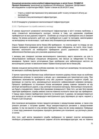 Концепція розвитку велосипедної інфраструктури в місті Києві. РОЗДІЛ ІІІ. Проект документу, винесений на громадське обговорення. Замовник: Департамент містобудування та архітектури КМДА. Проект станом на 26.04.2017 року -