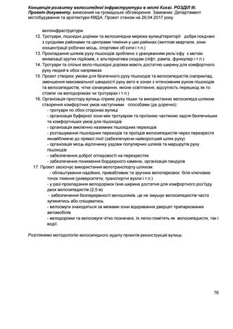 Концепція розвитку велосипедної інфраструктури в місті Києві. РОЗДІЛ ІІІ. Проект документу, винесений на громадське обговорення. Замовник: Департамент містобудування та архітектури КМДА. Проект станом на 26.04.2017 року велоінфраструктури 12. Тротуари, пішохідні доріжки та велосипедна мережа вулиці/території добре поєднані з сусідніми районами та центрами тяжіння у цих районах (житлові квартали, зони концентрації робочих місць, спортивні об’єкти і т.п.) 13. Прокладання шляхів руху пішоходів зроблено з урахуванням рель’єфу з метою мінімізації крутих підйомів, є альтернатива сходам (ліфт, рампа, фунікулер і т.п.) 14. Тротуари та спільні вело-пішохідні доріжки мають достатню ширину для комфортного руху людей в обох напрямках 15. Проект створює умови для безпечного руху пішоходів та велосипедистів (наприклад, зменшення максимальної швидкості руху авто в зонах з інтенсивним рухом пішоходів та велосипедистів, чітке ознакування, якісне освітлення, відсутність перешкод як то стовпи на велодоріжках чи тротуарах і т.п.) 16. Організація простору вулиць сприяє руху пішки та використанню велосипеда шляхом створення комфортних умов наступними способами (де доречно): тротуари по обох сторонах вулиці - організація буферної зони між тротуаром та проїзною частиною задля безпечніших та комфортніших умов для пішоходів - організація виключно наземних пішохідних переходів - розташування пішохідних переходів та проїздів велосипедистів через перехрестя якнайближче до прямої лінії (забезпечуючи найкоротший шлях руху) - організація місць відпочинку уздовж популярних шляхів та маршрутів руху пішоходів - забезпечення доброї оглядовості на перехрестях забезпечення пониження бордюрного каменю, організація пандусів 17. Проект заохочує використання велотранспорту шляхом: - облаштування надійних, привабливих та зручних велопарковок біля ключових точок тяжіння (університети, транспортні вузли і т.п.) - у разі прокладання велодоріжок їхня ширина достатня для комфортного роз’їзду двох велосипедистів (2,5 м) - забезпечення безперервності велошляхів, це не змушує велосипедистів часто зупинятись або спішуватись - велосмуги знаходяться за межами зони відкривання дверцят припаркованих автомобілів велодоріжки та велосмуги чітко позначені, їх легко помітять як велосипедисти, так і водії. Розглянемо мотодологію велосипедного аудиту проектів реконструкцій вулиць: