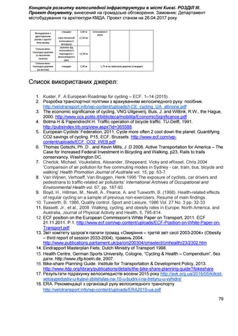 Список використаних джерел: 1. Kuster, F. A European Roadmap for cycling – ECF. 1–14 (2015). 2. Розробка транспортної політики з врахуванням велосипедного руху: посібник. http://velotransport.info/wp-content/uploads/I-CE_cycling_UA_allinone.pdf 3. The economic significance of cycling, VNG Uitgeverij, Buis, J. and Wittink, R.W., the Hague, 2000. http://www.ocs.polito.it/biblioteca/mobilita/EconomicSignificance.pdf 4. Botma H & Papendrecht H. Traffic operation of bicycle traffic. TU-Delft, 1991. http://pubsindex.trb.org/view.aspx?id=365588. 5. European Cyclists’ Federation, 2011, Cycle more often 2 cool down the planet: Quantifying CO2 savings of cycling. P15, ECF, Brussels. http://www.ecf.com/wpcontent/uploads/ECF_CO2_WEB.pdf 6. Thomas Gotschi, Ph .D . and Kevin Mills, J .D 2008, Active Transportation for America – The Case for Increased Federal Investment in Bicycling and Walking, p23, Rails to trails conservancy, Washington DC. 7. Chertok, Michael, Voukelatos, Alexander, Sheppeard, Vicky and яRissel, Chris 2004 'Comparison of air pollution for five commuting modes in Sydney - car, train, bus, bicycle and walking' Health Promotion Journal of Australia vol. 15, pp. 63-7. 8. Van Wijnen, Verhoeff, Van Bruggen, Henk 1995 'The exposure of cyclists, car drivers and pedestrians to traffic-related air pollutants' International Archives of Occupational and Environmental Health vol. 67, pp. 187-93. 9. Boyd, H., Hillman, M., Nevill, A., Pearce, A. and Tuxworth, B. (1998). Health-related effects of regular cycling on a sample of previous non-exercisers, Resume of main findings. 10. Tuxworth, B. 1986, Quality control. Sport and Leisure, 1986 Vol. 27 No. 3 pp. 32-33 11. Bassett, Jr., et al., 2008 Walking, cycling, and obesity rates in Europe, North America, and Australia, Journal of Physical Activity and Health, 5, 795-814. 12. ECF position on the European Commission’s White Paper on Transport, 2011. ECF 21.11.2011. P.1. http://www.ecf.com/wp-content/uploads/ECF-Position-on-White-Paper-onTransport.pdf 13. Звіт комітету здоров’я палати громад «Ожиріння – третій звіт сесії 2003-2004» (Obesity – third report of session 2033-2004), травень 2004. http://www.publications.parliament.uk/pa/cm200304/cmselect/cmhealth/23/2302.htm 14. Eindrapport Masterplan Fiets; Dutch Ministry of Transport 1998. 15. Health Centre, German Sports University, Cologne, “Cycling & Health – Compendium”, без дати. http://www.zfg-koeln.de, 2007. 16. Bike-share Planning Guide. Institute for Transportation & Development Policy, 2013. http://www.itdp.org/library/publications/details/the-bike-share-planning-guide?/bikeshare 17. Результати підрахунку велосипедистів восени 2015 року http://avk.org.ua/2016/05/kilkistvelosypedystiv-u-kyjevi-zbilshylas-na-10-u-budni-i-na-tretynu-u-vyhidni/ 18. ERA. Рекомендації з організації руху велосипедного транспорту http://velotransport.info/wp-content/uploads/ERA2010-ua.pdf 79