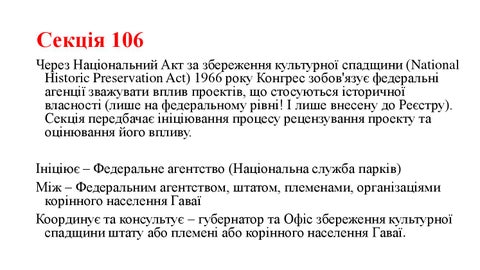 Секція 106 Через Національний Акт за збереження культурної спадщини (National Historic Preservation Act) 1966 року Конгрес зобов'язує федеральні агенції зважувати вплив проектів, що стосуються історичної власності (лише на федеральному рівні! І лише внесену до Реєстру). Секція передбачає ініціювання процесу рецензування проекту та оцінювання його впливу. Ініціює – Федеральне агентство (Національна служба парків) Між – Федеральним агентством, штатом, племенами, організаціями корінного населення Гаваї Координує та консультує – губернатор та Офіс збереження культурної спадщини штату або племені або корінного населення Гаваї.