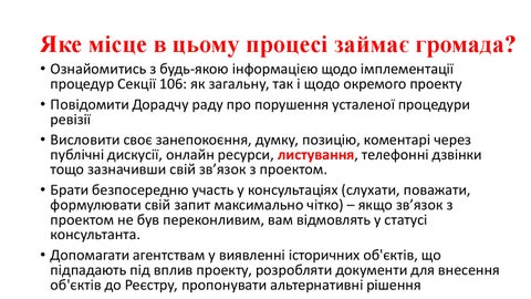Яке місце в цьому процесі займає громада? • Ознайомитись з будь-якою інформацією щодо імплементації процедур Секції 106: як загальну, так і щодо окремого проекту • Повідомити Дорадчу раду про порушення усталеної процедури ревізії • Висловити своє занепокоєння, думку, позицію, коментарі через публічні дискусії, онлайн ресурси, листування, телефонні дзвінки тощо зазначивши свій зв’язок з проектом. • Брати безпосередню участь у консультаціях (слухати, поважати, формулювати свій запит максимально чітко) – якщо зв’язок з проектом не був переконливим, вам відмовлять у статусі консультанта. • Допомагати агентствам у виявленні історичних об'єктів, що підпадають під вплив проекту, розробляти документи для внесення об'єктів до Реєстру, пропонувати альтернативні рішення