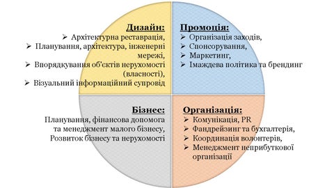 Дизайн: Архітектурна реставрація, Планування, архітектура, інженерні мережі, Впорядкування об'єктів нерухомості (власності), Візуальний інформаційний супровід