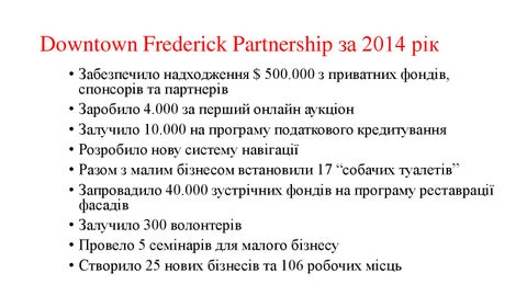 Downtown Frederick Partnership за 2014 рік • Забезпечило надходження $ 500.000 з приватних фондів, спонсорів та партнерів • Заробило 4.000 за перший онлайн аукціон • Залучило 10.000 на програму податкового кредитування • Розробило нову систему навігації • Разом з малим бізнесом встановили 17 “собачих туалетів” • Запровадило 40.000 зустрічних фондів на програму реставрації фасадів • Залучило 300 волонтерів • Провело 5 семінарів для малого бізнесу • Створило 25 нових бізнесів та 106 робочих місць