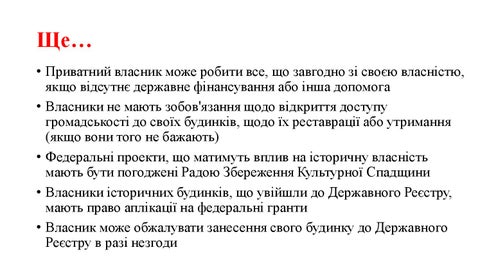 Ще… • Приватний власник може робити все, що завгодно зі своєю власністю, якщо відсутнє державне фінансування або інша допомога • Власники не мають зобов'язання щодо відкриття доступу громадськості до своїх будинків, щодо їх реставрації або утримання (якщо вони того не бажають) • Федеральні проекти, що матимуть вплив на історичну власність мають бути погоджені Радою Збереження Культурної Спадщини • Власники історичних будинків, що увійшли до Державного Реєстру, мають право аплікації на федеральні гранти • Власник може обжалувати занесення свого будинку до Державного Реєстру в разі незгоди