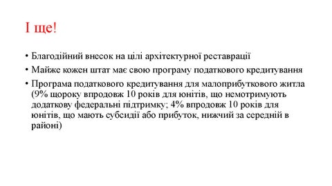 І ще! • Благодійний внесок на цілі архітектурної реставрації • Майже кожен штат має свою програму податкового кредитування • Програма податкового кредитування для малоприбуткового житла (9% щороку впродовж 10 років для юнітів, що немотримують додаткову федеральні підтримку; 4% впродовж 10 років для юнітів, що мають субсидії або прибуток, нижчий за середній в районі)