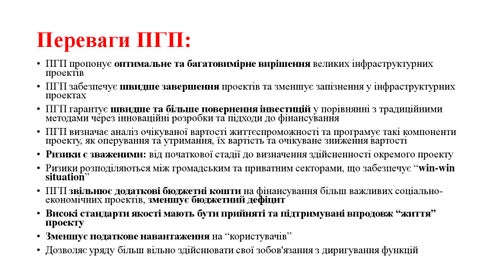 Переваги ПГП: • ПГП пропонує оптимальне та багатовимірне вирішення великих інфраструктурних проектів • ПГП забезпечує швидше завершення проектів та зменшує запізнення у інфраструктурних проектах • ПГП гарантує швидше та більше повернення інвестицій у порівнянні з традиційними методами через інноваційні розробки та підходи до фінансування • ПГП визначає аналіз очікуваної вартості життєспроможності та програмує такі компоненти проекту, як оперування та утримання, їх вартість та очікуване зниження вартості • Ризики є зваженими: від початкової стадії до визначення здійсненності окремого проекту • Ризики розподіляються між громадським та приватним секторами, що забезпечує “win-win situation” • ПГП звільнює додаткові бюджетні кошти на фінансування більш важливих соціальноекономічних проектів, зменшує бюджетний дефіцит • Високі стандарти якості мають бути прийняті та підтримувані впродовж “життя” проекту • Зменшує податкове навантаження на “користувачів” • Дозволяє уряду більш вільно здійснювати свої зобов'язання з диригування функцій