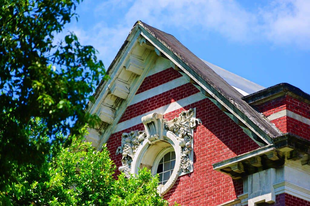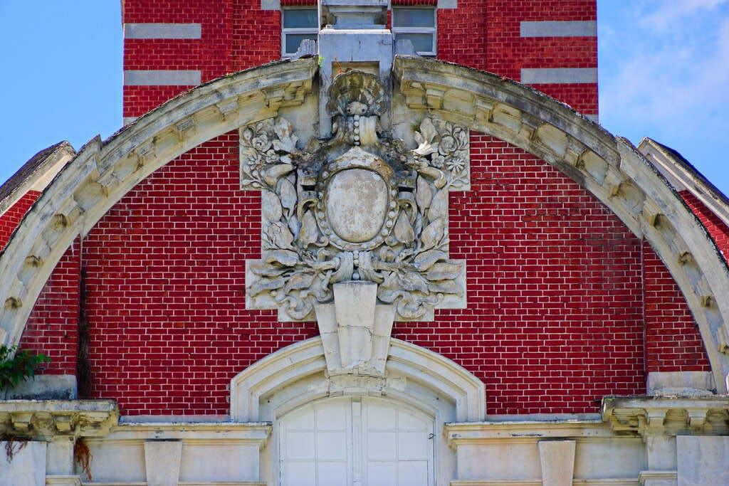 -正前方有圓形山牆,牆面上方設計有一巴洛克風格的勳章飾紋,其中央 有一橢圓突起,周遭並搭配漩渦花紋,十分醒目。