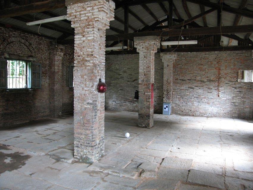 -最西側的一棟雖然沒有M字型的屋頂,但是其跨距仍是相當的大,建築 的特別之處為磚砌的拱門及梯形柱。