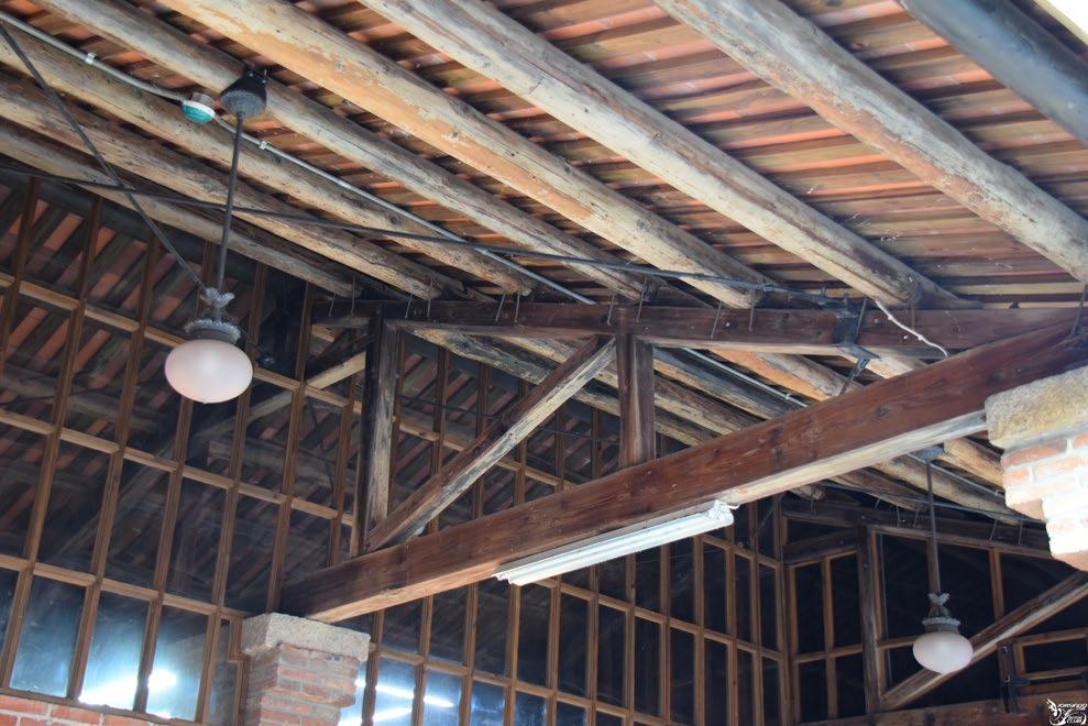 -屋頂架構承載使用當時西式建築中偏好的大跨距木桁架、樑下加有石板 柱頭的方形磚柱承重。