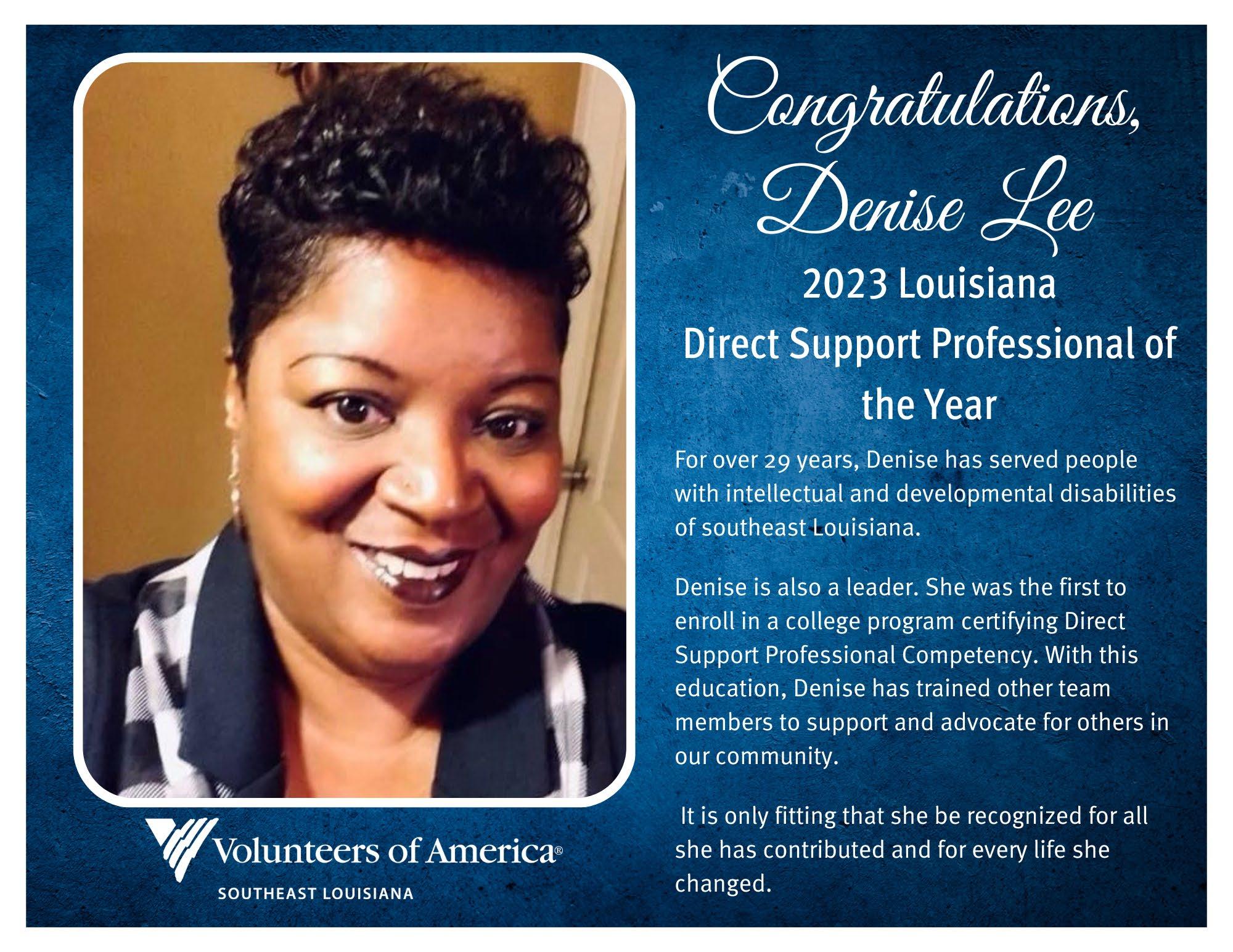 Throughout her more than 25-year career, Denise has supported many people through job placements, romantic and interpersonal relationships, and travels to countries around the world! Denise has helped them achieve selfdirection and learn to advocate for themselves and others with disabilities. One person Denise supported over the years became a relentless advocate for herself and others, even traveling on several occasions to Baton Rouge to speak on behalf of herself and others in special legislative sessions when funding for services was in jeopardy.