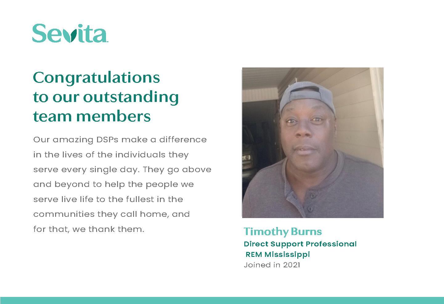 It is Timothy’smission to support a qualitylife and increase the independenceof the men he supports. As a result, the men are able to do more for themselves, participatein a variety of activities, and have strengthened friendships/connections. Timothyunderstandsthat thisis all part of personcentered supports, and gives specific detailswhen training new support team members so they can do the same.