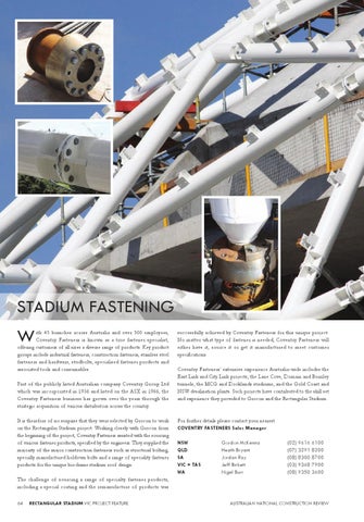 STADIUM FastenING ith 45 branches across Australia and over 500 employees, Coventry Fasteners is known as a true fastener specialist, offering customers of all sizes a diverse range of products. Key product groups include industrial fasteners, construction fasteners, stainless steel fasteners and hardware, studbolts, specialised fastener products and associated tools and consumables. Part of the publicly listed Australian company Coventry Group Ltd which was incorporated in 1936 and listed on the ASX in 1966, the Coventry Fasteners business has grown over the years through the strategic acquisition of various distributors across the country. It is therefore of no surprise that they were selected by Grocon to work on the Rectangular Stadium project. Working closely with Grocon from the beginning of the project, Coventry Fasteners assisted with the sourcing of various fastener products, specified by the engineers. They supplied the majority of the major construction fasteners such as structural bolting, specially manufactured holdown bolts and a range of speciality fastener products for the unique bio-frame stadium roof design.