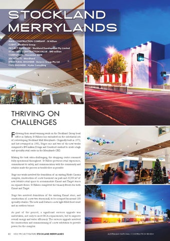ollowing their award-winning work on the Stockland Group head office in Sydney, St Hilliers has embarked on the substantial job of redeveloping Stockland Mall Merrylands. Originally built in 1972, and last revamped in 1981, Stages one and two of the new works comprised a $90 million Design and Construct contract to create a high end specialty retail centre in the Merrylands CBD. Making the task extra-challenging, the shopping centre remained fully operational throughout. St Hillers previous retail experience, commitment to safety, and communication with the community and retailers made the process as trouble-free as possible. Stage one works involved the demolition of an existing Hoyts Cinema complex, construction of a new basement car park and 20,000 m2 of new lettable retail space to accommodate Kmart and Target stores on separate floors. St Hilliers completed the tenancy fitouts for both Kmart and Target. Stage two involved demolition of the existing Kmart store, and construction of a new two storey mall, to be occupied by around 100 specialty retailers. The new mall features a new light-filled food court and an outdoor terrace. As part of the project, a significant services upgrade was undertaken, not only to meet BCA requirements, but to improve overall energy and water efficiency. The services upgrade involved the construction and commissioning of a new substation to provide power for the complex. 82