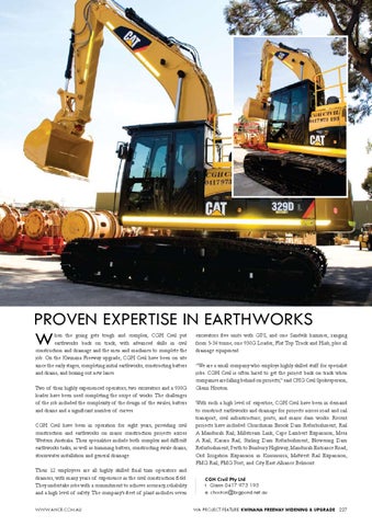excavators five units with GPS, and one Sandvik hammer, ranging from 5-36 tonne, one 930G Loader, Flat Top Truck and Hiab, plus all drainage equipment. “We are a small company who employs highly skilled staff for specialist jobs. CGH Civil is often hired to get the project back on track when companies are falling behind on projects,” said CHG Civil Spokesperson, Glenn Hooton. With such a high level of expertise, CGH Civil have been in demand to construct earthworks and drainage for projects across road and rail transport, civil infrastructure; ports; and major dam works. Recent projects have included Churchman Brook Dam Refurbishment; Rail A Mandurah Rail; Millstream Link; Cape Lambert Expansion; Mesa A Rail; Karara Rail; Stirling Dam Refurbishment; Blowering Dam Refurbishment; Perth to Bunbury Highway; Mandurah Entrance Road; Ord Irrigation Expansion in Kununurra; Midwest Rail Expansion; FMG Rail; FMG Port; and City East Alliance Belmont. CGH Civil Pty Ltd t. Glenn 0417 973 193 e. chooton@bigpond.net.au WA PROJECT FEATURE KWINANA FREEWAY WIDENING & UPGRADE 227