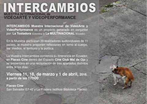 VIDEOARTE Y VIDEOPERFORMANCE INTERCAMBIOS Muestra Internacional de VideoArte y VideoPerformance es un proyecto generado en conjuntor por: La Tostadora (Colombia) y La MULTINACIONAL (Ecuador). En la Muestra participan 39 realizadores audioviduales de 11 países, la muestra proponen reflexiones en torno al cuerpo, los medios, el territorio y la política. La Muestra Intercambios comienza su itinerancia en Ecuador, en Flacso Cine dentro del Espacio Cine Club Mal de Ojo y se presentara en una recopilación de tres apartados distintos entre sí los días: