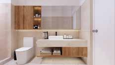 Mueble bajo estructurado en melamina de 18mm color Teka ártico marca ARAUCO con apertura de cajones push con correderas de cierre lento. poyo lateral estructurado en melamina 18mm RH color Roble rustico marca VESTO y pared enchapada en espejo importado con borde biselado pulido recto